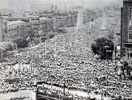 ฝูงชนเคลื่อนตัวออกจากสนามฟุตบอลมาอออยู่เต็มปากทางลอดตึกโดม แล้วก็ไหลลอดตึกโดยเลี้ยวขวาไปตามถนนเป็นแนวยาวเหยียดระลอกแล้วระลอกเล่าจาก 12.00 น. จนถึง 15.30 น. ลอดใต้ตึกห้องสมุดทางด้านประตูท่าพระอาทิตย์ เลียบเชิงสะพานปิ่นเกล้าแล้วเข้าถนนราชดำเนิน ข้ามสะพานผ่านพิภพลีลามุ่งสู่อนุสาวรีประชาธิปไตย ประมาณกันว่าวันนั้นมีนักเรียน นิสิตนักศึกษา และประชาชนเข้าร่วมเดินขบวนถึงกว่า 5 แสนคน