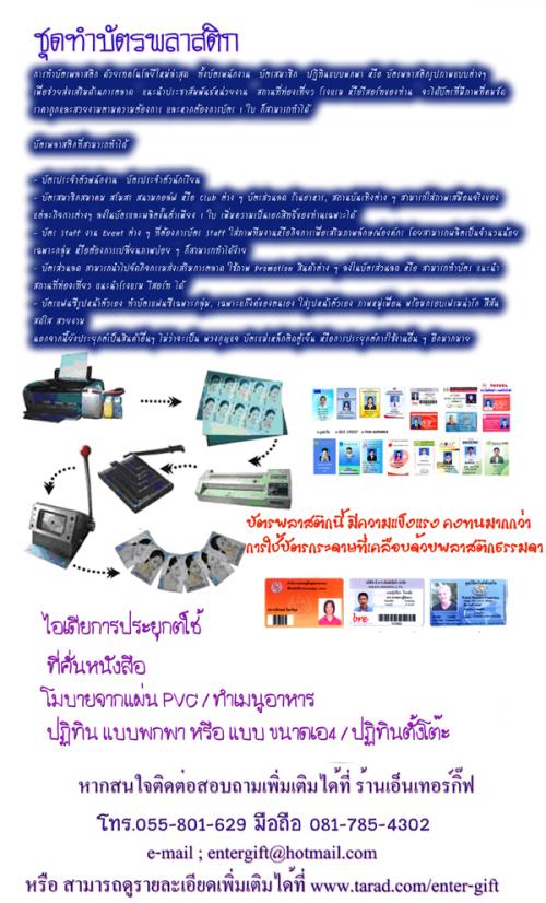การทำบัตรพลาสติก ด้วยเทคโนโลยีใหม่ล่าสุด ทั้งบัตรพนักงาน บัตรสมาชิก ปฏิทินแบบพกพา หรือ บัตรพลาสติกรูปภาพแบบต่างๆ เพื่อช่วยส่งเสริมด้านการตลาด แนะนำประชาสัมพันธ์หน่วยงาน สถานที่ท่องเที่ยว โรงแรม หรือรีสอร์ทของท่าน จะได้บัตรที่มีภาพที่คมชัด ราคาถูกและสวยงามตามความต้องการ และหากต้องการบัตรเพียง 1 ใบ ก็สามารถทำได้ ทำง่ายไม่ยุ่งยาก