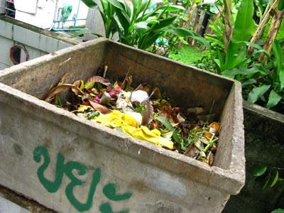 ขั้นตอนที่ 4 เมื่อคนส่วนผสมต่าง ๆ เข้ากันดีแล้ว ให้นำเศษอาหาร เศษผัก ผลไม้ สับเป็นชิ้นเล็ก ๆ ใส่ลงไปในถุงปุ๋ย แล้วนำถุงปุ๋ยนั้นใส่ลงในถังหมักดังกล่าว กดให้น้ำท่วมถุง หรือหาวัตถุที่มีน้ำหนักวางทับลงไปอีกทีหนึ่ง จากนั้นก็ปิดฝาให้สนิท