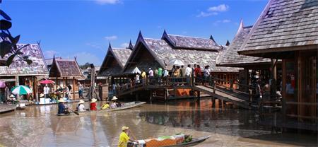 มีกลิ่นอายแบบไทย ๆ ให้ได้สัมผัส มีการจำลองบ้านเรือนไทยแบบโบราณของแต่ละภาคเรียงรายเอาไว้ตลอดสองข้างทาง มีชุมชนการค้าริมน้ำในอดีต โดยแม่ค้า พ่อขาย จะพายเรือไปตามแม่น้ำเพื่อขายสินค้า เราก็สามารถเรียกแม่ค้า พ่อค้า ที่พายเรือผ่านไปผ่านมา เพื่อซื้อหาสินค้าได้