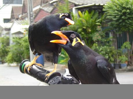 ...เจ้านกขุนทองที่หน้ากุฏิพระค่ะ แถวนั้นมีแมวมาสุมหัวอยู่เยอะ คาดว่าคนผ่านไปมา ใคร ๆ ก็คงแวะเล่นแมว นานวันเข้านกขุนทองมันเลยจำเสียงเวลาคนเรียกแมวซะ....เป็นว่า...นกร้องเหมี๊ยวๆไปเลย...นกพันธุ์ใหม่..
