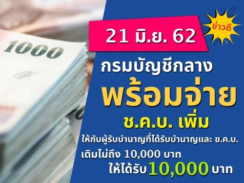 21 มิ.ย. 62 กรมบัญชีกลางพร้อมจ่าย ช.ค.บ. เพิ่ม ให้กับผู้รับบำนาญที่ได้รับบำนาญและ ช.ค.บ. เดิมไม่ถึง 10,000 บาท ให้ได้รับ 10,000 บาท