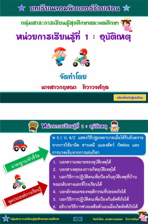 บทเรียนคอมพิวเตอร์ช่วยสอน กลุ่มสาระการเรียนรู้สุขศึกษาและพลศึกษา หน่วยการเรียนรู้ที่ 1 อุบัติเหตุ ผลงานครูครูกฤษณา ทิวาวงศ์กุล