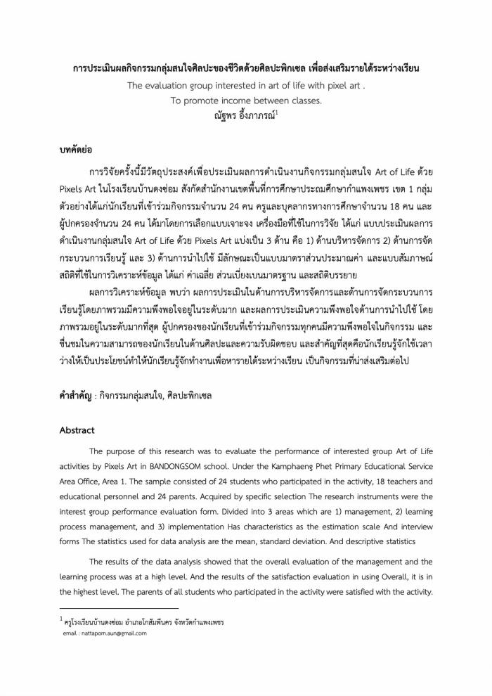 การประเมินผลกิจกรรมกลุ่มสนใจศิลปะของชีวิตด้วยศิลปะพิกเซล เพื่อส่งเสริมรายได้ระหว่างเรียน : ณัฐพร อึ้งภาภรณ์