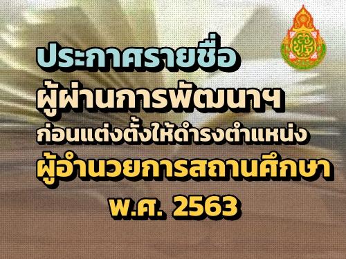 ประกาศรายชื่อผู้ผ่านการพัฒนาข้าราชการครูและบุคลากรทางการศึกษาก่อนแต่งตั้งให้ดำรงตำแหน่งผู้อำนวยการสถานศึกษา พ.ศ. 2563