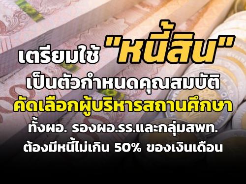เตรียมใช้ "หนี้สิน"เป็นตัวกำหนดคุณสมบัติคัดเลือกผู้บริหารสถานศึกษา ทั้ง ผอ. รองผอ.รร.และกลุ่มสพท. ต้องมีหนี้ไม่เกิน 50% ของเงินเดือน