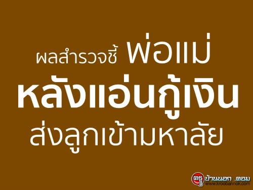 ผลสำรวจชี้ พ่อแม่หลังแอ่นกู้เงิน ส่งลูกเข้ามหาลัย อ่านต่อคลิก[29 เม.ย. 2559](อ่าน 10,824 ครั้ง) (0.51%-315 ผู้โหวต) |