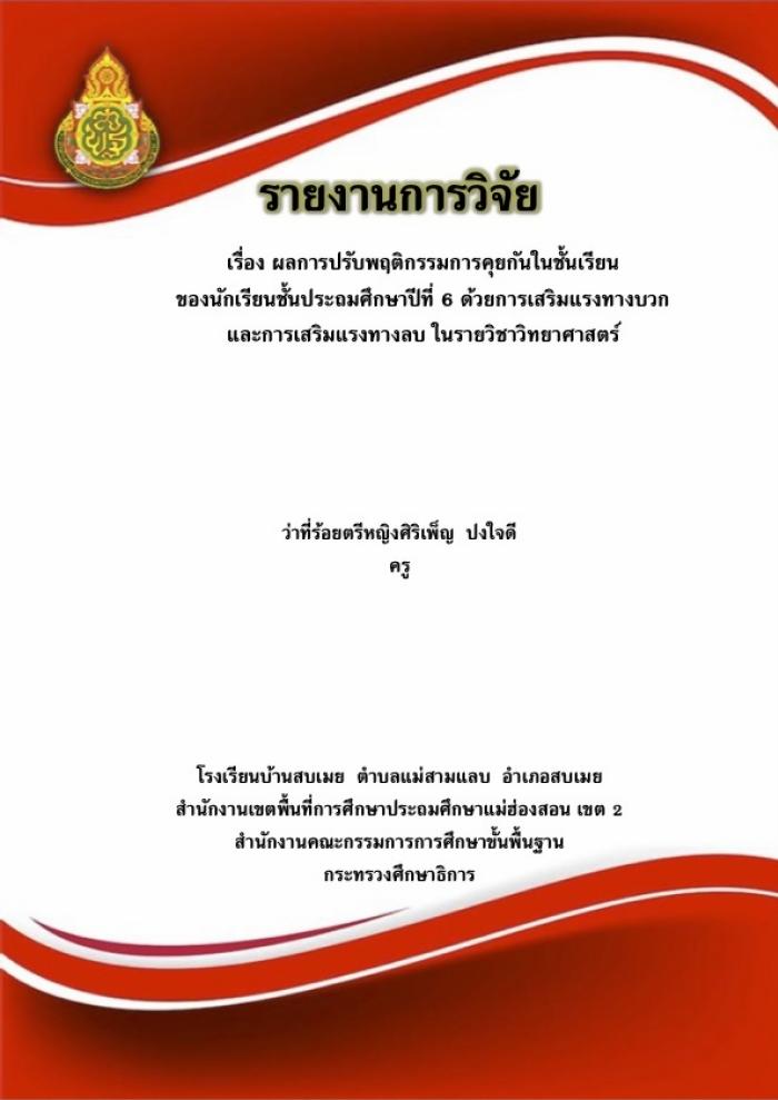 รายงานการวิจัย ผลการปรับพฤติกรรมการคุยกันในชั้นเรียนของนักเรียนชั้นประถมศึกษาปีที่6ด้วยการเสริมแรงทางบวก และการเสริมแรงทางลบ ผลงานครูศิริเพ็ญ ปงใจดี