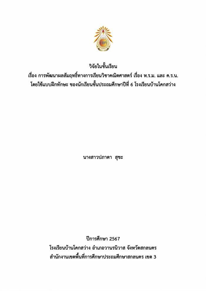 การพัฒนาผลสัมฤทธิ์ทางการเรียนวิชาค.ิตศาสตร์ เรื่อง ห.ร.ม. และ ค.ร.น. โดยใช้แบบฝึกทักษะ ของนักเรียนชั้นประถมศึกษาปีที่ 6 โรงเรียนบ้านโค.สว่าง : ปภาดา สุขะ