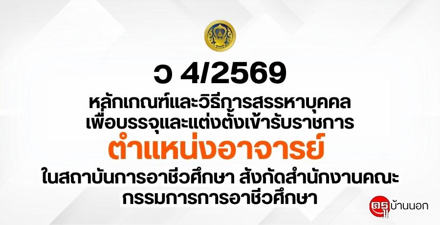 ว 4/2569 หลักเกณฑ์และวิธีการสรรหาบุคคลเพื่อบรรจุและแต่งตั้งเข้ารับราชการเป็นข้าราชการครูและบุคลากรทางการศึกษา ตำแหน่งอาจารย์ ในสถาบันการอาชีวศึกษา สังกัดสำนักงานคณะกรรมการการอาชีวศึกษา