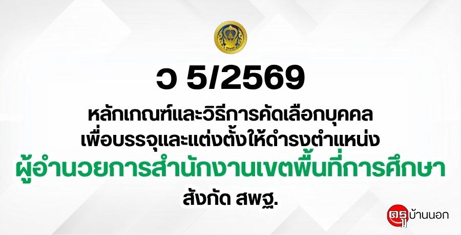 ว 5/2569 หลักเกณฑ์และวิธีการคัดเลือกบุคคลเพื่อบรรจุและแต่งตั้งให้ดำรงตำแหน่งผู้อำนวยการสำนักงานเขตพื้นที่การศึกษา สังกัดสำนักงานคณะกรรมการการศึกษาขั้นพื้นฐาน
