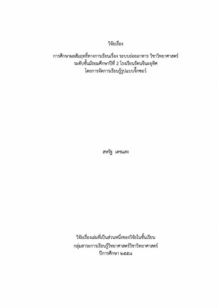 การศึกษาผลสัมฤทธิ์ทางการเรียนเรื่อง ระบบย่อยอาหาร วิชาวิทยาศาสตร์ ระดับชั้นมัธยมศึกษาปีที่ 2 โรงเรียนรัตนจีนะอุทิศ โดยการจัดการเรียนรู้รูปแบบจิ๊กซอว์ : สหรัฐ เดชแสง