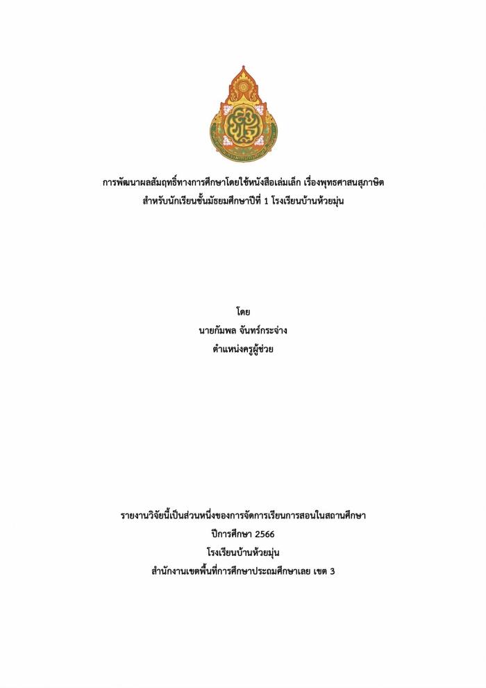 การพัฒนาผลสัมฤทธิ์ทางการศึกษาโดยใช้หนังสือเล่มเล็ก เรื่องพุทธศาสนสุภาษิต สำหรับนักเรียนชั้นมัธยมศึกษาปีที่ 1 โรงเรียนบ้านห้วยมุ่น : กัมพล จันทร์กระจ่าง