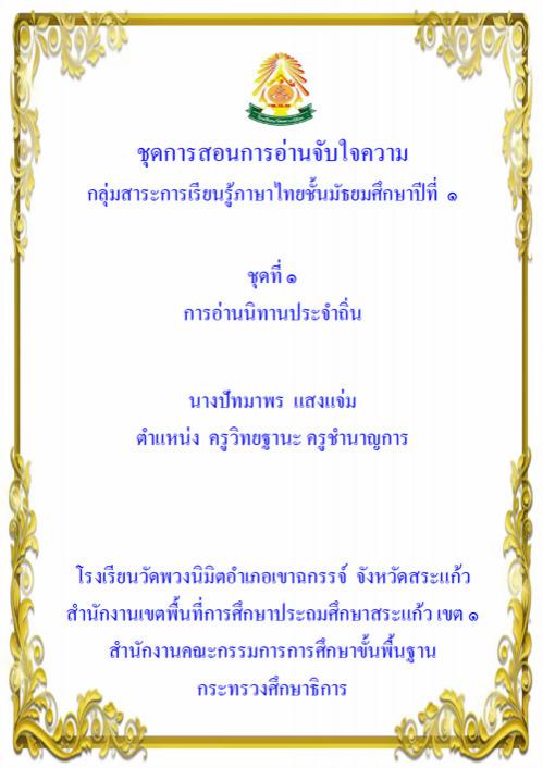 ชุดการสอนการอ่านจับใจความ กลุ่มสาระการเรียนรู้ภาษาไทย ชั้นมัธยมศึกษาปีที่ 1 ชุดที่ 1 การอ่านนิทานประจำถิ่น ผลงานครูปัทมาพร แสงแจ่ม