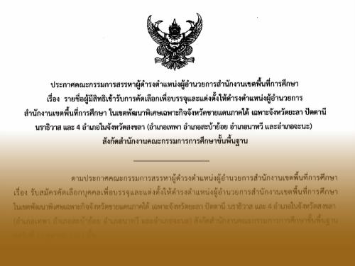 ประกาศรายชื่อผู้ได้รับการคัดเลือกเพื่อบรรจุและแต่งตั้งให้ดำรงตำแหน่งผู้อำนวยการสำนักงานเขตพื้นที่การศึกษา ในเขตพัฒนาพิเศษเฉพาะกิจจังหวัดชายแดนภาคใต้ฯ