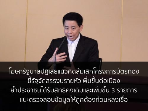 โฆษกรัฐบาลปฏิเสธแนวคิดล้มเลิกโครงการบัตรทอง ชี้รัฐจัดสรรงบรายหัวเพิ่มขึ้นต่อเนื่อง ย้ำประชาชนได้รับสิทธิคงเดิมและเพิ่มขึ้น 3 รายการ