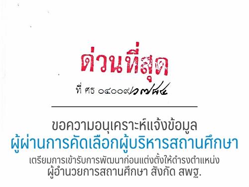 สพฐ.แจ้ง ศธจ.ขอข้อมูลผู้ผ่านการคัดเลือกผู้บริหารสถานศึกษาเตรียมการเข้ารับการพัฒนาก่อนแต่งตั้งให้ดำรงตำแหน่งผู้อำนวยการสถานศึกษา สังกัด สพฐ.