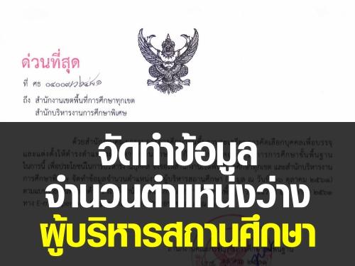 สพฐ.มีหนังสือแจ้งทุกเขตพื้นที่จัดทำข้อมูลจำนวนตำแหน่งว่างผู้บริหารสถานศึกษา