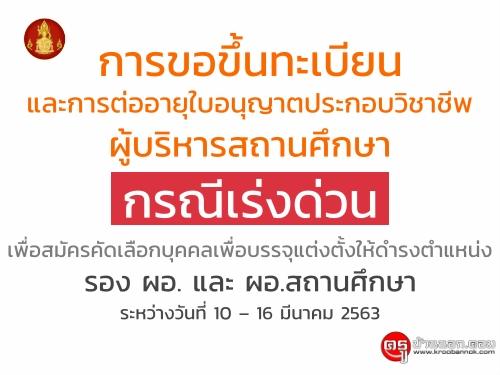 การขอขึ้นทะเบียนและการต่ออายุใบอนุญาตประกอบวิชาชีพผู้บริหารสถานศึกษา กรณีเร่งด่วน ระหว่างวันที่ 10 – 16 มีนาคม 2563
