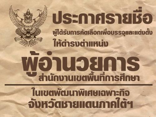 ประกาศรายชื่อผู้ได้รับการคัดเลือกเพื่อบรรจุและแต่งตั้งให้ดำรงตำแหน่งผู้อำนวยการสำนักงานเขตพื้นที่การศึกษา ในเขตพัฒนาพิเศษเฉพาะกิจจังหวัดชายแดนภาคใต้ฯ