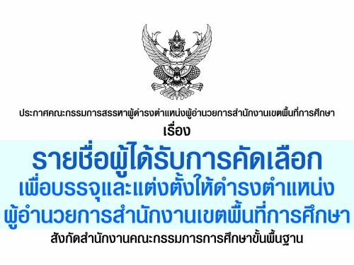 ประกาศรายชื่อผู้ได้รับการคัดเลือกเพื่อบรรจุและแต่งตั้งให้ดำรงตำแหน่งผู้อำนวยการสำนักงานเขตพื้นที่การศึกษา สังกัดสพฐ.