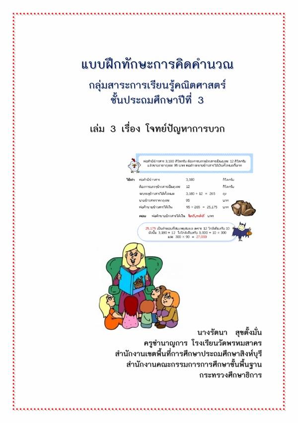 แบบฝึกทักษะการคิดคำนวณ คณิตศาสตร์ ป.3 เรื่อง โจทย์ปัญหาการบวก ผลงานครูรัตนา สุขตั้งมั่น
