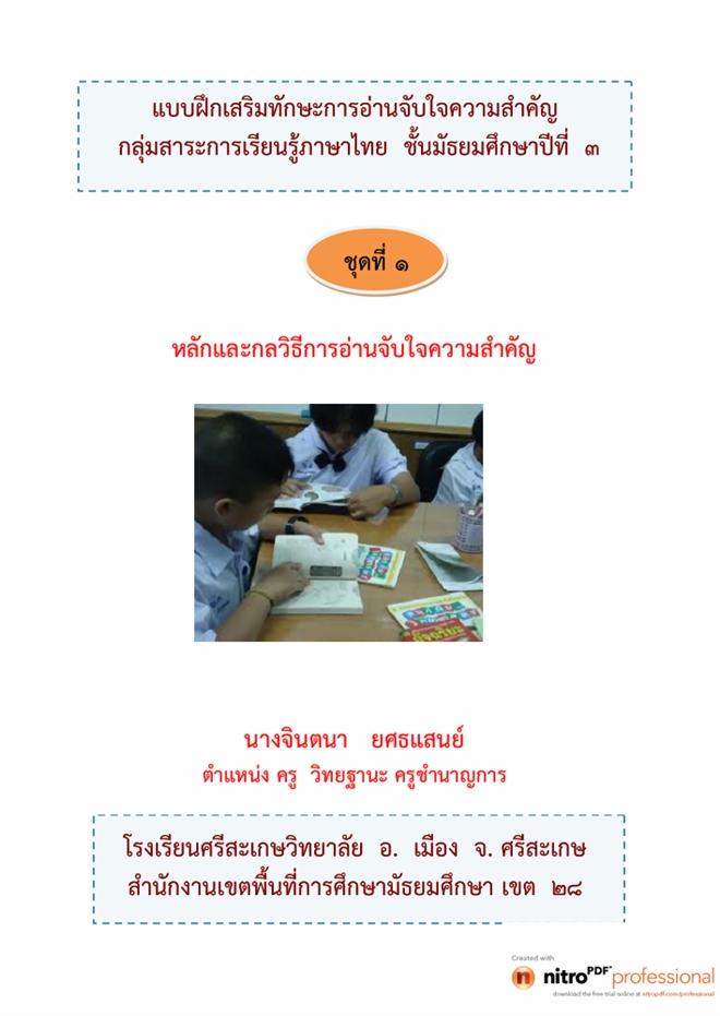 แบบฝึกเสริมทักษะการอ่านจับใจความสําคัญ ภาษาไทย ม.3 ผลงานครูจินตนา ยศธแสนย์