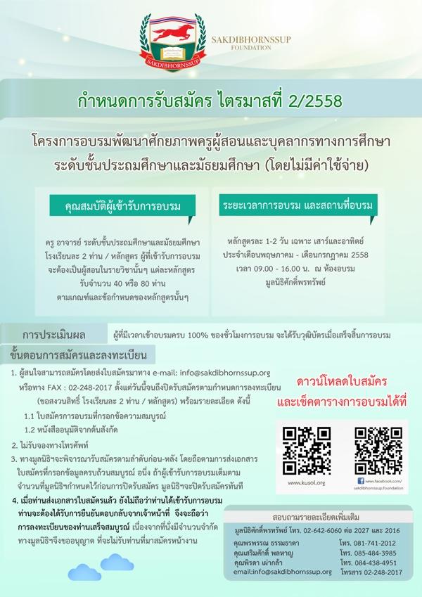 เปิดรับสมัครอบรมครู ฟรี! โครงการอบรมพัฒนาศักยภาพครูผู้สอนระดับประถมศึกษาและมัธยมศึกษา เดือน ก.พ.-พ.ค.59