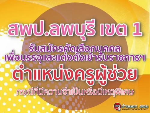 ลพบุรี เขต 1 รับสมัครคัดเลือกบุคคลเพื่อบรรจุและแต่งตั้งเข้ารับราชการฯ ตำแหน่งครูผู้ช่วย กรณีที่มีความจำเป็นหรือมีเหตุพิเศษ