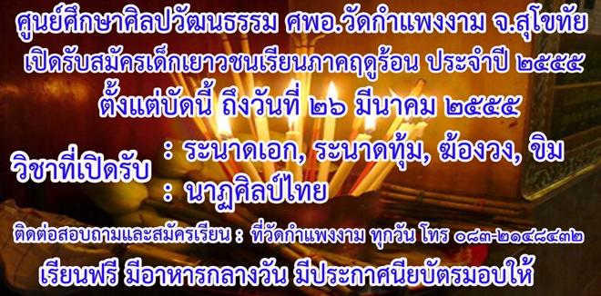 ศูนย์ศึกษาพระพุทธศาสนาวันอาทิตย์วัดกำแพงงามรับสมัครอบรม ดนตรีไทยภาคฤดูร้อนประจำปี ๒๕๕๕