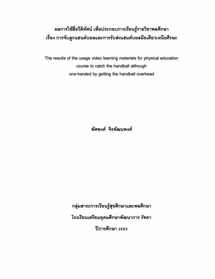 ผลการใช้สื่อวิดีทัศน์ เพื่อประกอบการเรียนรู้รายวิชาพลศึกษา เรื่องการจับลูกแฮนด์บอลและการรับส่งแฮนด์บอลมือเดียวเหนือศีรษะ : พัศพงศ์ จิรพัฒนพงศ์