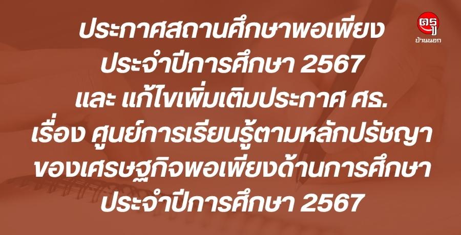 ประกาศสถานศึกษาพอเพียง ประจำปีการศึกษา 2567 และ แก้ไขเพิ่มเติมประกาศ กระทรวงศึกษาธิการ เรื่อง ศูนย์การเรียนรู้ตามหลักปรัชญาของเศรษฐกิจพอเพียงด้านการศึกษา ประจำปีการศึกษา 2567 ลงวันที่ 15 ธันวาคม 2568