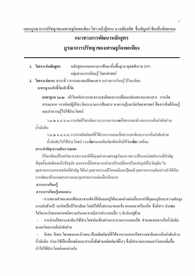 แผนบูรณาการปรัชญาของเศรษฐกิจขอเพียง วิชา เคมี ผลงานครูเพียงพิศ ชื่นพิบูลย์