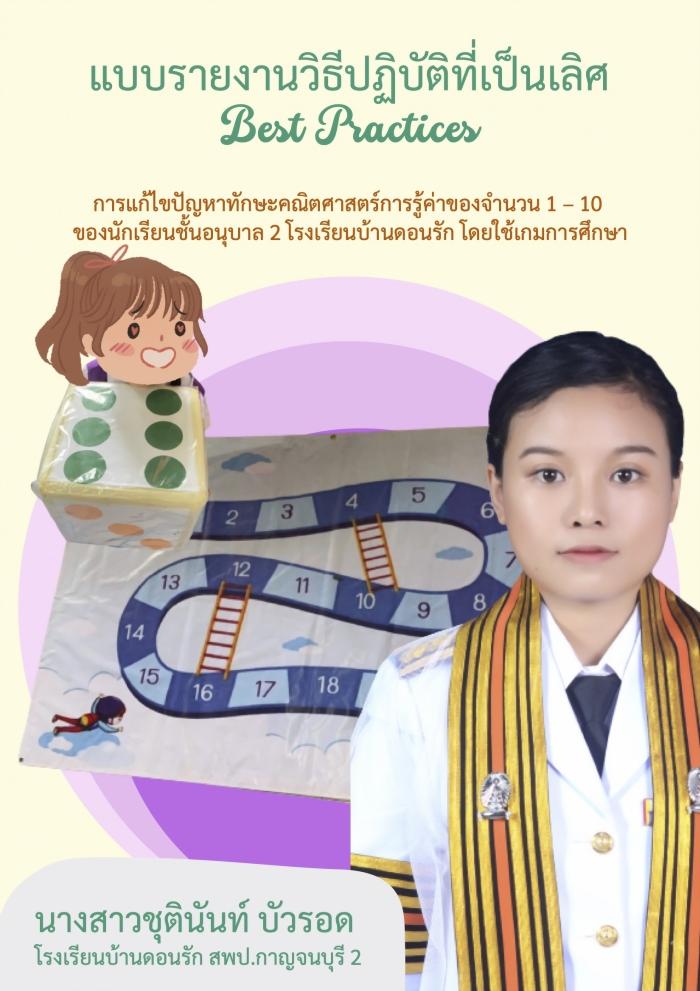 แบบรายงานวิธีปฏิบัติที่เป็นเลิศ การแก้ไขปัญหาทักษะคณิตศาสตร์การรู้ค่าของจำนวน 1-10 ของนักเรียนชั้นอนุบาล 2 โรงเรียนบ้านดอนรัก โดยใช้เกมการศึกษา : ชุตินันท์ บัวรอด
