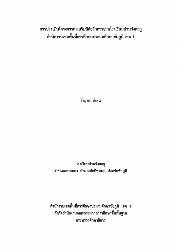 การประเมินโครงการส่งเสริมนิสัยรักการอ่านโรงเรียนบ้านวังตะกู สำนักงานเขตพื้นที่การศึกษาประถมศึกษาชัยภูมิ เขต 1