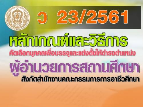 ว 23/2561 หลักเกณฑ์และวิธีการคัดเลือกบุคคลเพื่อบรรจุและแต่งตั้งให้ดำรงตำแหน่งผู้อำนวยการสถานศึกษาสังกัดสำนักงานคณะกรรมการการอาชีวศึกษา