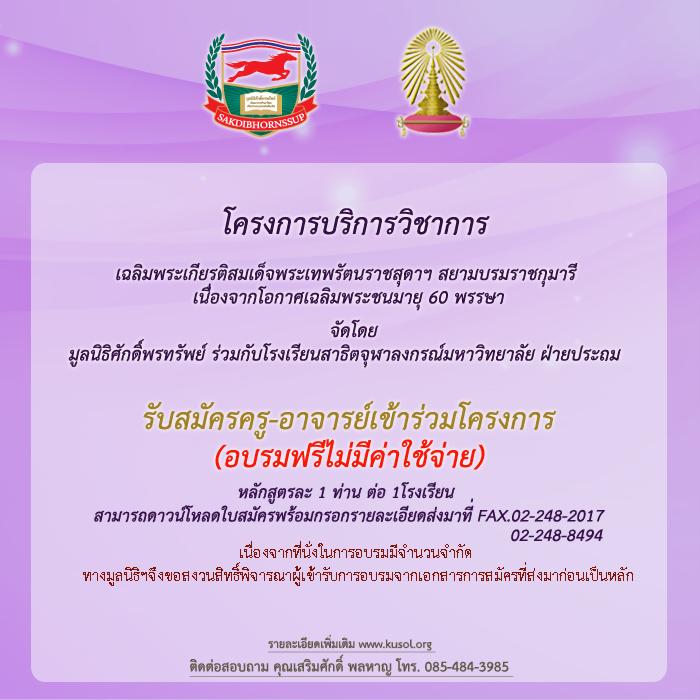 ประชาสัมพันธ์โครงการบริการวิชาการ(อบรมฟรีไม่มีค่า)เปิดรับสมัครครู-อาจารย์เข้าร่วมโครงการ หลักสูตรละ 1 ท่าน ต่อ 1โรงเรียน