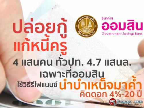 ปล่อยกู้แก้หนี้ครู 4 แสนคน ทั่วปท. 4.7 แสนล.เฉพาะที่ออมสินใช้วิธีรีไฟแนนซ์นำบำเหน็จมาค้ำคิดดอก 4%-20 ปี