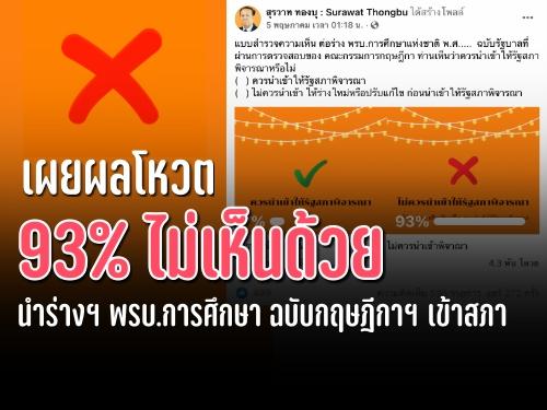 เผยผลโหวต ไม่เห็นด้วยนำร่าง พรบ.การศึกษาแห่งชาติ พ.ศ... ฉบับรัฐบาลที่ผ่านการตรวจสอบของคณะกรรมการกฤษฎีกาเข้าสภาฯ