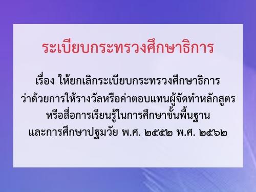 ระเบียบศธ. ให้ยกเลิกระเบียบฯ ว่าด้วยการให้รางวัลหรือค่าตอบแทนผู้จัดทำหลักสูตรหรือสื่อการเรียนรู้ในการศึกษาขั้นพื้นฐานและการศึกษาปฐมวัย พ.ศ. ๒