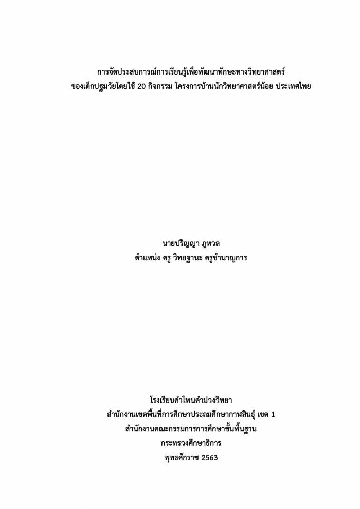 การจัดประสบการณ์การเรียนรู้เพื่อพัฒนาทักษะทางวิทยาศาสตร์ ของเด็กปฐมวัยโดยใช้ 20 กิจกรรม โครงการบ้านนักวิทยาศาสตร์น้อย ประเทศไทย : นายปริญญา ภูหวล