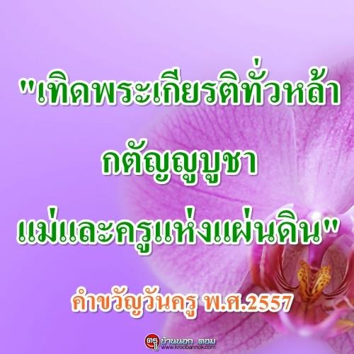 คำขวัญวันครู พ.ศ. 2557 "เทิดพระเกียรติทั่วหล้า กตัญญูบูชา แม่และครูแห่งแผ่นดิน"