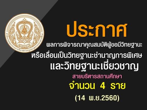 ก.ค.ศ.ประกาศผลการพิจารณาคุณสมบัติผู้ขอมีวิทยฐานะหรือเลื่อนเป็นวิทยฐานะชำนาญการพิเศษและวิทยฐานะเชี่ยวชาญ 4 ราย (14 พ.ย.2560)