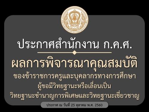 ก.ค.ศ.ประกาศผลการพิจารณาคุณสมบัติผู้ขอมีวิทยฐานะหรือเลื่อนเป็นวิทยฐานะชำนาญการพิเศษและวิทยฐานะเชี่ยวชาญ (25 ตุลาคม 2560)