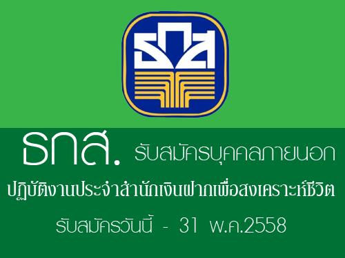 ธกส. รับสมัครบุคคลภายนอก เพื่อปฏิบัติงานประจำสำนักเงินฝากเพื่อสงเคราะห์ชีวิต เปิดรับสมัคร 6 - 31 พฤษภาคม 2558