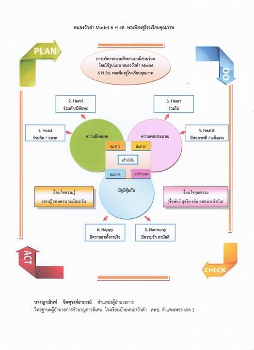 "หนองวัวดำ Model 6 H 5 ส. พอเพียงสู่โรงเรียนคุณภาพ" ผลงานนางญาณินท์ จิตตุรงค์อาภรณ์ ผอ.โรงเรียนบ้านหนองวัวดำ