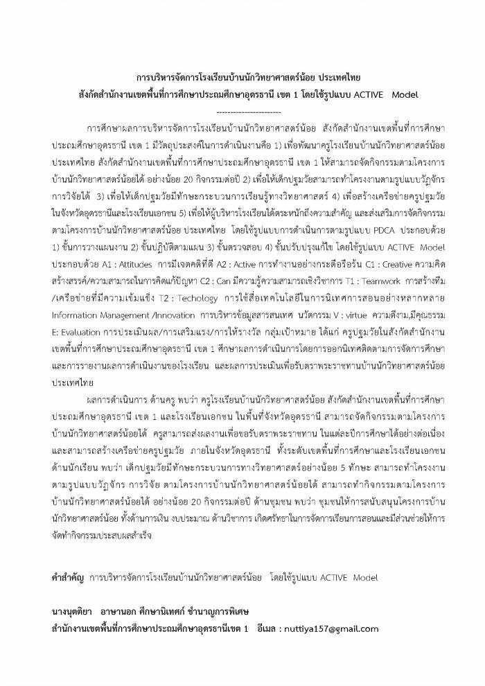 การบริหารจัดการโรงเรียนบ้านนักวิทยาศาสตร์น้อย ประเทศไทย สังกัดสพป.อุดรธานี เขต 1 โดยใช้รูปแบบ ACTIVE Model ผลงานของนางนุตติยา อาษานอก