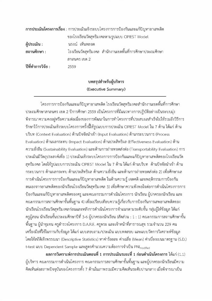 การประเมินโครงการเรื่อง : การประเมินเชิงระบบโครงการการป้องกันและแก้ปัญหายาเสพติด ของโรงเรียนวัดสุทธิมงคลตามรูปแบบ CIPIEST Model ของนายนรงณ์ เห็นหลอด