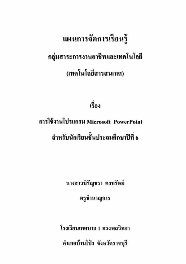 แผนการจัดการเรียนรู้ การใช้งานโปรแกรม Microsoft PoWerPoint ชั้น ป.6 ผลงานครูนิรัญชรา คงทรัพย์
