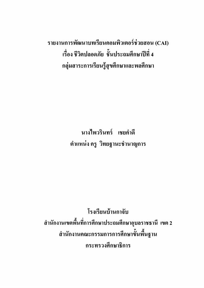 รายงานการพัฒนาบทเรียนคอมพิวเตอร์ช่วยสอน (((CAI))) เรื่อง ชีวิตปลอดภัย ผลงานครูไพวรินทร์ เชยคำดี